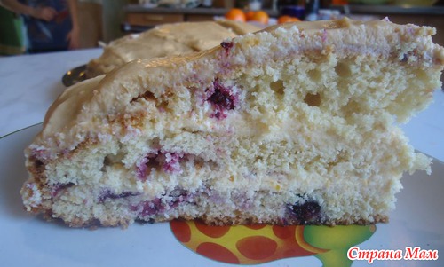 стакан сахара, стакан манки, стакан сметаны, 100 грамм маргарина растопленного, разрыхлитель, 2 яйца, стакан муки. Все перемешать. Еще я добавляю замороженные ягоды, в данном случае смородину, и ванилин. выпекать примерно 45 минут при 190 градусах Кстати, он очень долго не черствеет