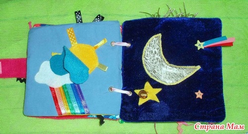 Страничка Ночь Месяц блестящий и шершавый, звездочки пуговки и фетровая звездочка с бубенчиком (громко звенит)
