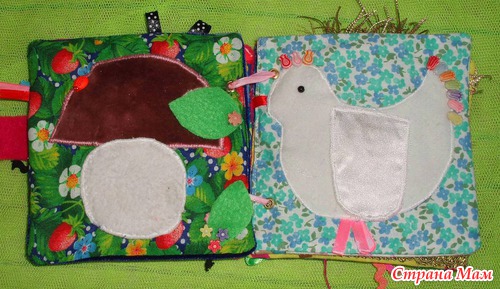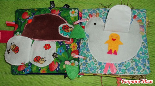 Страничка Грибок В пушистой шляпке находятся шарики. Дверка шуршит на кнопке. Листики отгибаются. Различные бусины и пуговки.
