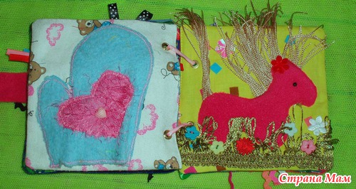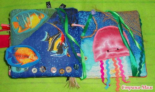 Страничка Рыбки Две рыбки на липке, могут по очереди "спать" (в кармане из сетки) и "плавать" (крепится на липку). Также изучение понятий узкий, широкий, темный, светлый, волнистый на тесьмах-водорослях. Внизу различные пуговки-камешки