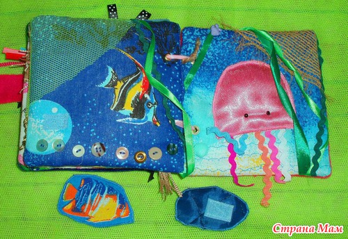Страничка Медуза Медуза мягкая, разноцветные лапки - подвижные. В левом верхнем углу на лентовке перемещается красивая рыбка - пуговка, также есть пуговка ракушка, водоросли-тесьмы, веревочка с узелками и сетка в правом углу.