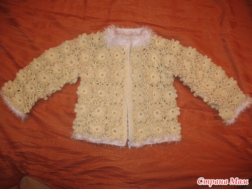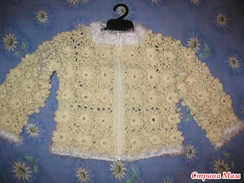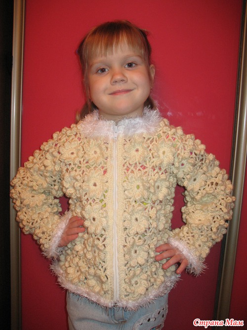 Долго не могла придумать, что связать из ниточек, которые отдала мне мама. Однажды увидела жилетку"пухлые цветочки", которая и вдохновила меня.