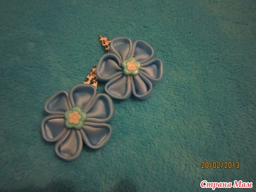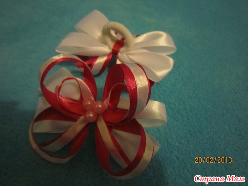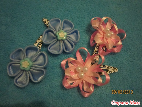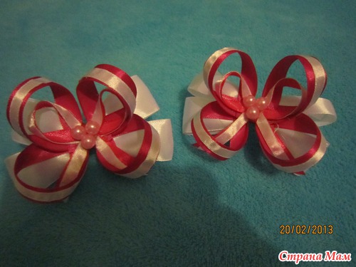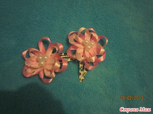 вот по этому http://rykodelkiledie.blogspot.ru/2012/08/1.html были сделаны малиновые и голубые, только серединку я сделала из 2 лент 0,5 см