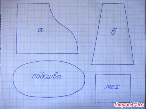 6. Ножки — плотная ткань. Подошва — 2 детали, застежки — 2 детали, деталь а — 4 шт., деталь б — 2 шт., шнур 25 см — 2 шт., меховые детали — 2 шт., ленточки для стягивания длиной 10 см — 2 шт. Припуск на шов у всех деталей 0,5 см.