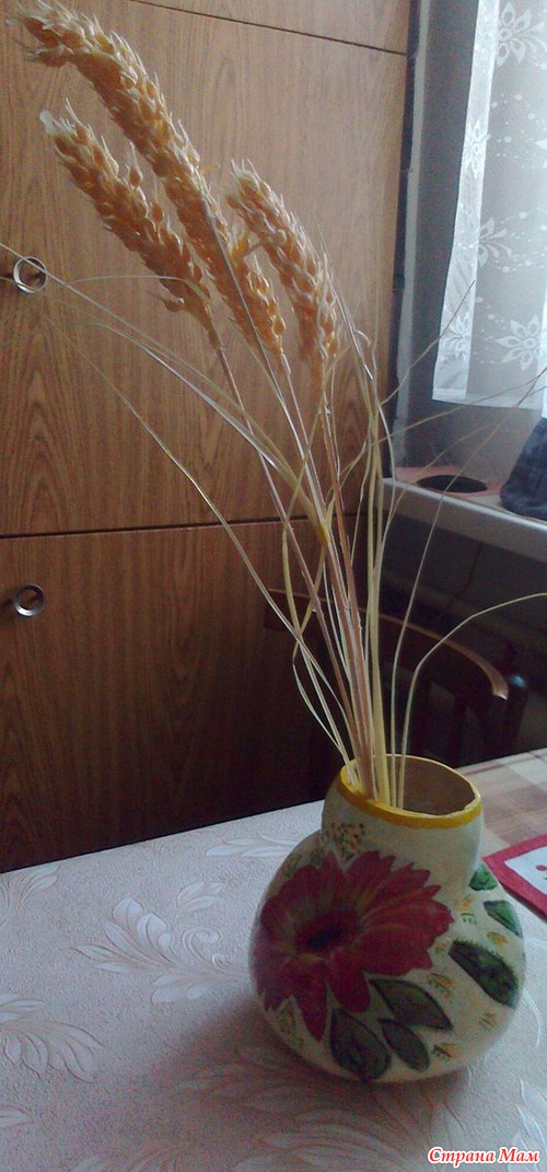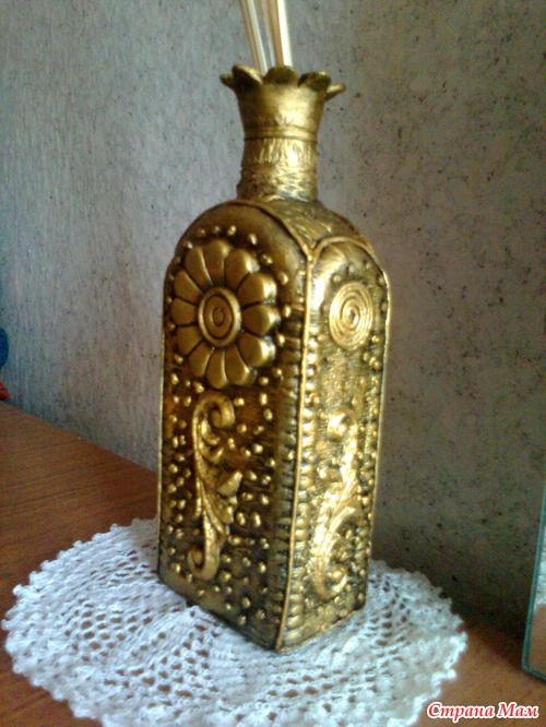 Бутылка - ваза. На ней намешано всего. Здесь пошли в работу: салфетки, туалетная бумага, самозатвердевающая глина, гипс, папье-маше.