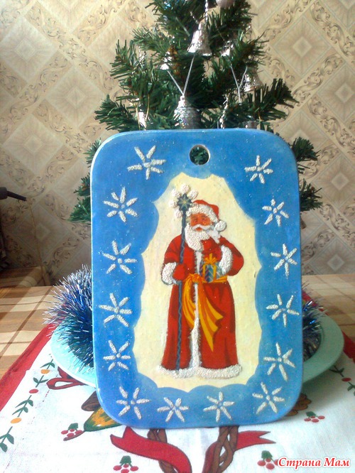 Самый первый мой декупаж. Досочка (делала перед Новым Годом). Имитация снега манной крупой.