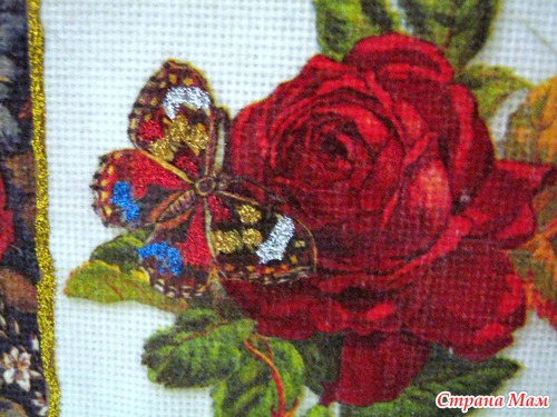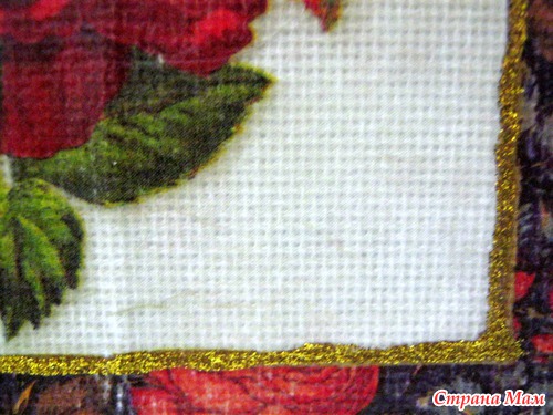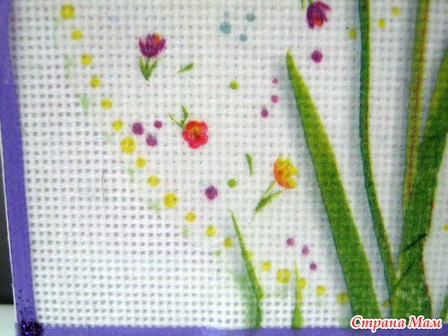 Выполнены в технике декупажа по канве (имитация вышивки крестом). Мотив приклеивается ПВА или спец. клеем для ткани на канву. Просушивается. В случае спец. клея - закрепляем утюгом с изнанки в режиме "Хлопок" 3-5 мин. Берем иголку, и прокалываем каждую клеточку в канве
