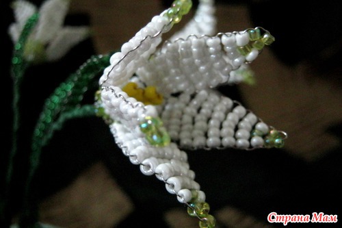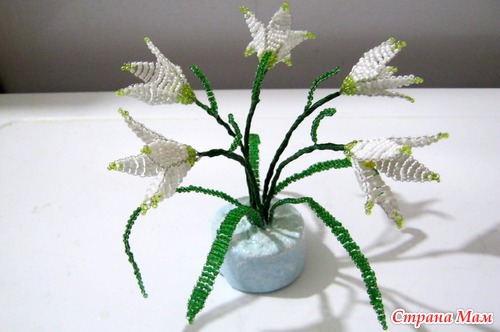 Подснежники из бисера, на проволоке. Основание - гипс, попытка имитации снега - манка с ПВА и лаком акриловым, акриловые краски (голубая и белая). Высота цветка с основанием 16 см, но поскольку цветы слегка наклонены, сама композиция немного ниже - 13 см. Читать полностью