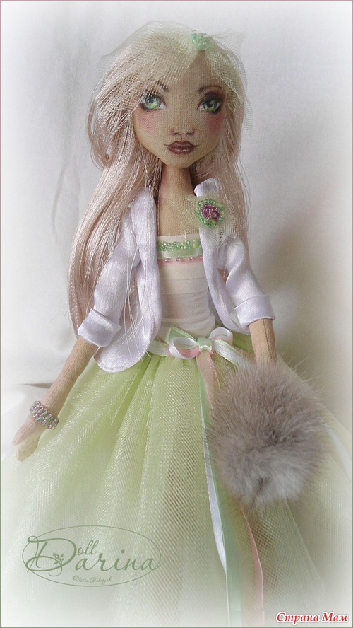 В работе использованы синтепон, лён, крепдышин, фатин, атлас, ленты атласные, люрекс и органза, бисер, шкурка норки. Ручная роспись.