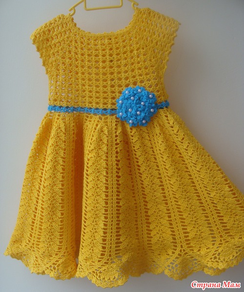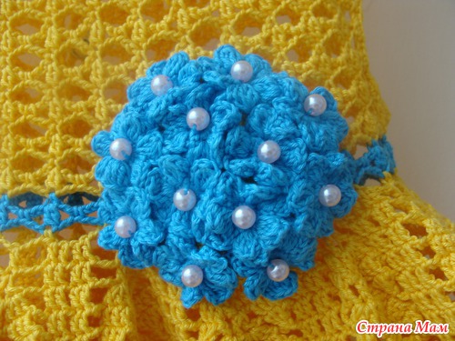 Летнее платьице для девочки 2-3 лет солнечного желтого цвета, украшено букетом голубых цветов, в серединке каждого цветка бусина. Связано платье крючком из 100% хлопка "Coco" производства Германия. Застегивается сзади на 3 кнопочки.