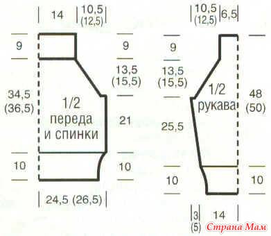 Рукава: набрать 42 п. и связать 10 см резинкой. Затем вязать лиц. гладью. Одновременно от резинки прибавить для скосов рукава с обеих сторон в каждом 10-м р. 5 х 1 п. (в каждом 6-м р. 8 х 1 п.) = 52 (58) п. Через 25,5 см = 56 р. от резинки выполнить с обеих сторон убавления для скосов реглана, как на спинке, но для особых убавлений провязать с правой стороны 3-ю и 4-ю п. вместе лиц., с левой стороны провязать 4-ю и 3-ю п. от конца вместе протяжкой. Внимание! Одновременно с началом реглана выполнить на средних 14 п. косу, продолжая вязать внешние петли лиц. гладью. Внутри косы прибавить по схеме 4 п., и таким образом ширина косы станет = 18 п. Через 39 см = 86 р. (41 см = 90 р.) от резинки продолжить вязать на оставшихся 24 п. планку следующим образом: кром., 1 п. изн. глади, 1 п. лиц. глади, 18 п. косы, 1 п. лиц. глади, 1 п. изн. глади, кром. Через 48 см = 106 р. (50 см = 110 р.) от резинки все петли закрыть по рисунку.