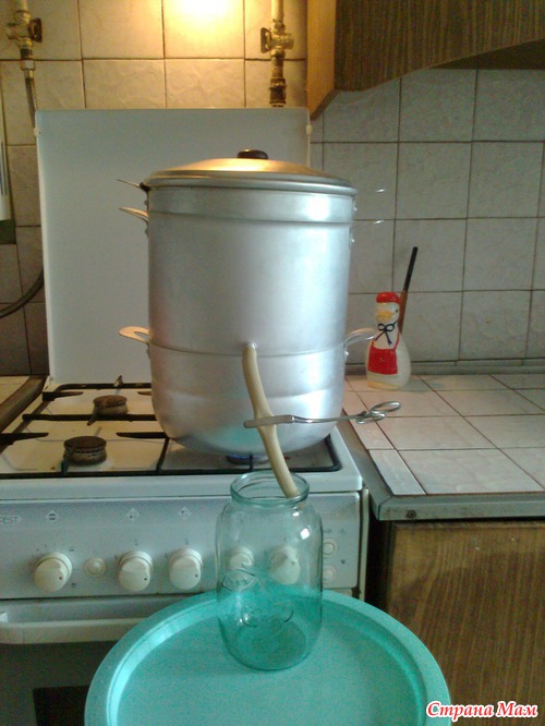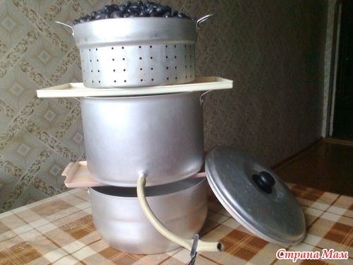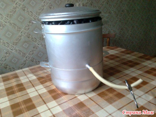 внизу-кипящая вода, как в пароварке, наверху - фрукты в корзине, в середине - резервуар для "выдавленного" с помощью пара сока, уже стерилизованного. Осталось слить через краник в банку и закатать