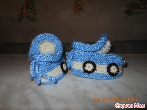 Крючком вяжем цепочку из 5-ти воздушных петель. Замыкаем в кольцо и делаем одну петлю для подъёма ряда. В каждой воздушной петле провязываем 2 столбика без накида. Всего 10 столбиков. Замыкаем, 1 возд. п. для подъема. Присоединяем черную нить. Опять в каждой петле по 2 столбика без накида (20 столбиков). Нить закрепляем. Колёса пришиваем к пинетки, вышиваем дворники и решетку. Приклеиваем номер машины. Пришиваем фары-пуговицы. Цифры номера можно вырезать из какой-нибудь этикетки. Вместо вязаных колёс можно пришить пуговицы. Выворачиваем наизнанку пинетку и начинаем сшивать верхнюю отделочную часть вертикальным трикотажным швом. Сшиваем только до основного цвета! Выворачиваем на лицевую и по кругу прикрепляем верхнюю отделочную часть. Если её не закрепить, в процессе носки она будет постоянно разворачиваться.