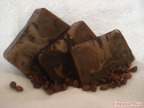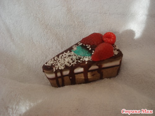 Ну раз начала с кофейной темы, так и продолжу... мыло "Кусочек кофейного тортика", поэкспериментировала так сказать в области мыльной кулинарии, хотелось бы форму тортика более реалистичную, но пока пользуюсь тем что есть.