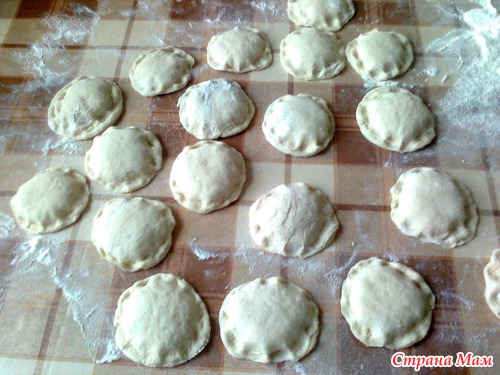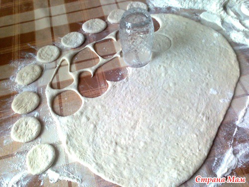 Раскатываем лепёшку толщиной с палец. Стаканом вырезаем круги (чтобы не прилипало, стакан обмакивать в муку). Делаем чётное количество лепёшечек.