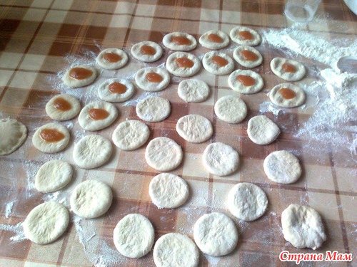 Выкладываем начинку. У меня повидло. Поэтому у меня сегодня будут пирожки. В следующий раз положу начинку из мяса и у меня получатся беляши.