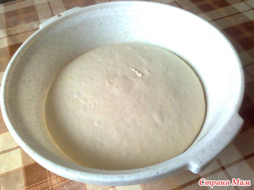 Итак, засыпаем-заливаем всё в двойном размере, и хорошо вымешиваем тесто руками минут 10-15. Пока тесто не станет отлипать от рук. Накрыть тесто и поставить в тёплое место подходить. Это тесто подошло. В объёме оно увеличилось в два раза.