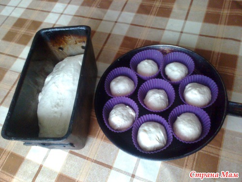 Осаживаем тесто и делим его на две одинаковых части. Одна часть у нас пойдёт на выпечку хлеба, из другой части теста будем печь шанежки и пирожки-беляши. Если у кого то нет формы для выпечки хлеба, можно выпекать в сковородке. Перед закладкой теста, форму для хлеба смазать маслом. На фото в силиконовых формах (8шт) наши шанежки. Это тот же хлеб, только ма-а-а-ленький. Это муж так их называет. Детки его очень любят. У соседки внучек очень плохо ест, пришлось ей покупать силиконовые формы, что бы печь шанежки. Ой, отвлеклась от теста. На шанежки пошла половина теста от той большой половины (1/4 часть от всего теста). Разложили по формам, накрываем всё и пусть подходят