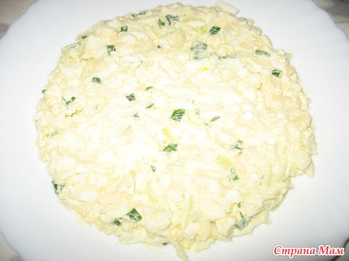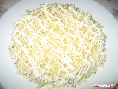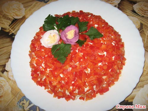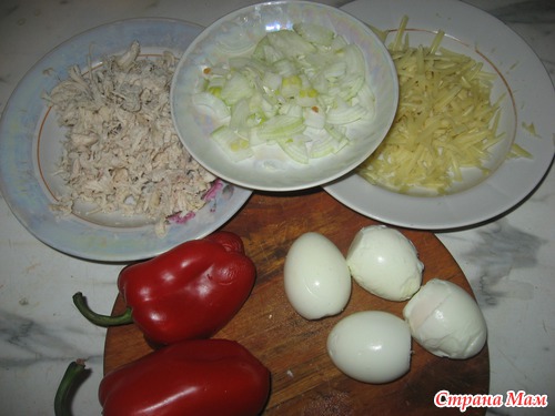 Окорочок отварить (воду посолить и приправить) и разобрать на волокна.. яйца отварить и измельчить... луковицу тонко порезать и залить кипятком, сыр потереть на крупной терке.. перец порезать мелким кубиком.. Собрать салат слоями - яйца+лук ( у меня немного зеленых перьев было.. тоже добавила)+майонез по вкусу