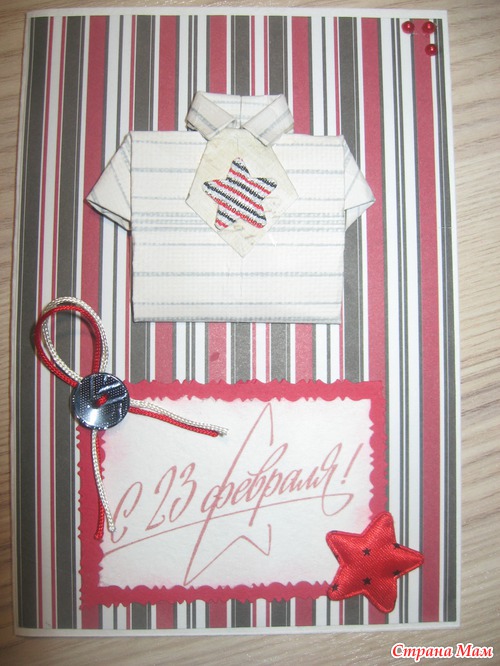 спасибо большое. а почему оригинальные? вот в виде рубашки вроде как оригинальные. я одну сделала еле-еле такую с рубашкой. вот намучилась. делала маленькую рубашку, и видимо пропорции листа что ли неправильно посчитала, короче долго и нудно я ее крутила. все-таки получилась конечно, но не совсем такая как у всех. и галстук тоже не полностью получился. а в основном все открытки такие обычные, из украшений только звезды, шнурки и сизаль. и все. ну и бумага, и картинки, надписи.
