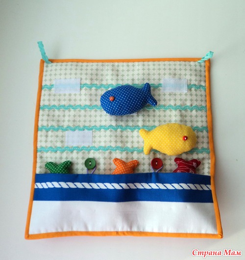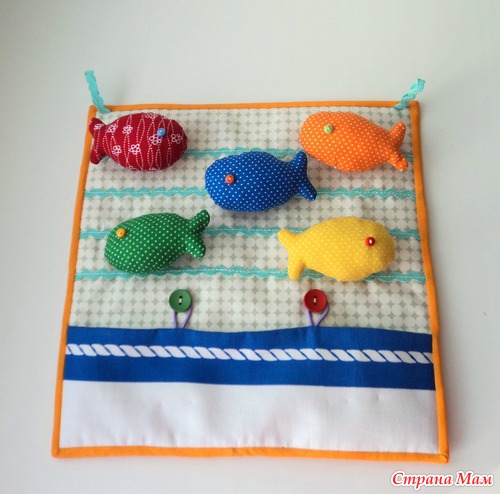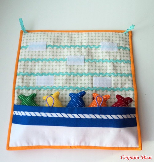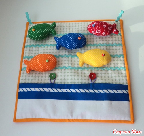 Панно размером 25х25. Разноцветные рыбки крепятся на липучки, внизу кармашек на пуговках, чтобы складывать рыбок. Учим цвета, счет до пяти, право-лево. Есть две петельки - можно подвесить.