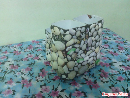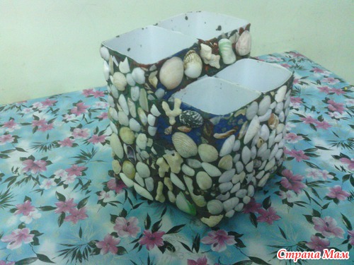 смастерили мои детки вот такую карандашницу, вернее сделала то её я, из пластиковых бутылок собрала, скотчем обмотала, а вот детки уже решили оформить: облепили пластилином, приклеили на него ракушек