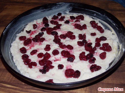 4. Взбитые белки аккуратно ввести в кашу. Выложить половину массы, разложить вишню, накрыть второй половиной и смазать последним желтком