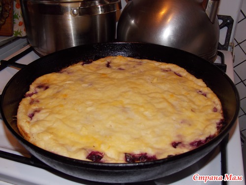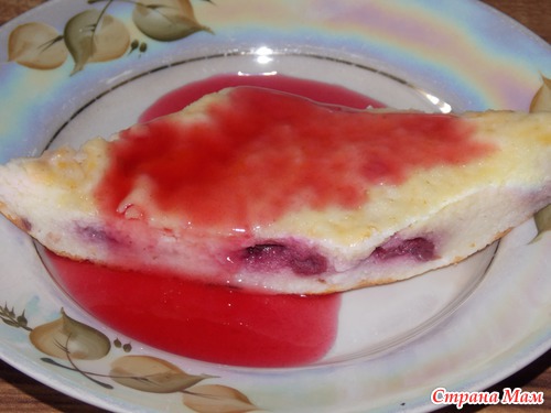 Нужно: 1л молока, 160-180 гр ( неполный стакан) манки, вишня б/к (или другие фрукты), сахар, соль, 3 яйца.