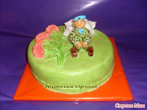 Привет подружки, заказали тортик к дню защитника отечества десантнику вот что получилось, хотела из айсинга сделать травку, но что-то не очень
