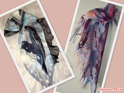 А вот шарфы, палантины, шапочки и шляпки, блузки и кофточки, то есть те вещи которые соприкасаются с нежными частями тела:головой-это лицо, уши и подбородок;шеей;областью декольте, изготавливаются их нежнейшего мериноса 13-19 микрон. Это самая популярная шерсть. Изделия не пушатся и не колются. Так же широко используется микс из шерсти и шелка, где может присутствовать до 50% шелка. Огромная цветовая палится. Вещи из такой шерсти вполне можно носить и летом, т. к. известно, что шелк холодит. Поэтому ощущения от изделий из шерсти с шелком самые приятные-ощущения легкости, невесомости и прохлады струящегося шелка.