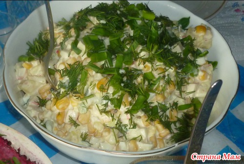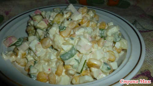 Ну любит мой муж салаты с крабовыми палочками, меняла уже составы бесконечно, а всё равно с краб. палочками самый любимый. Вот и фантазирую с тем, что есть в наличие.