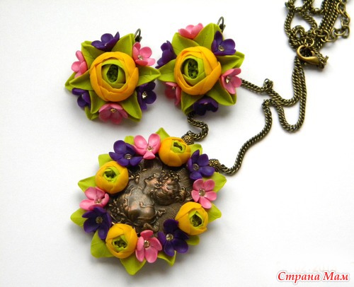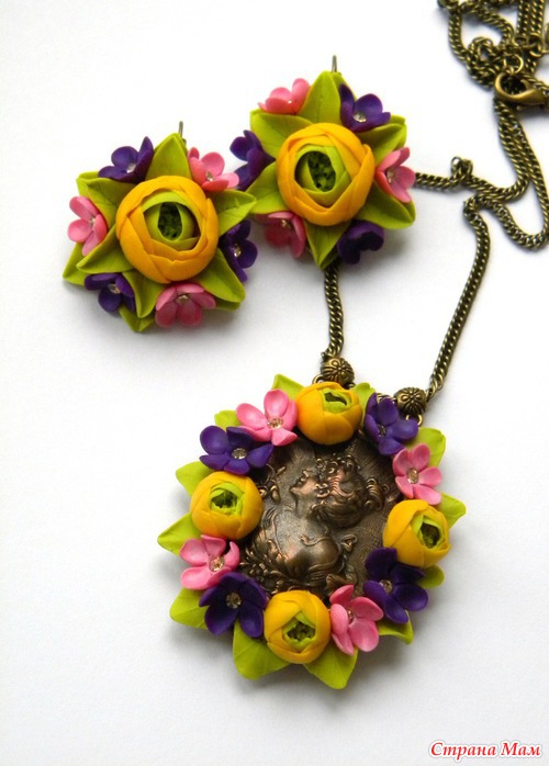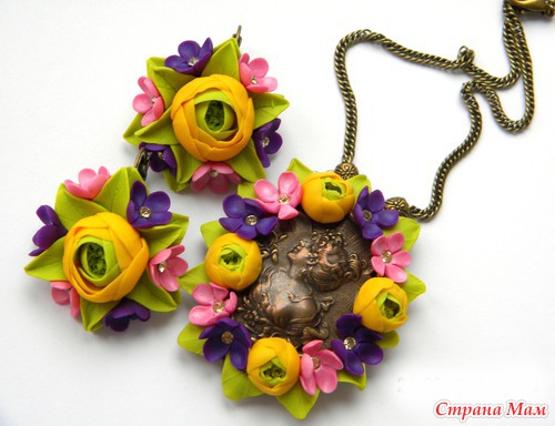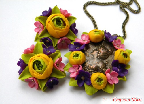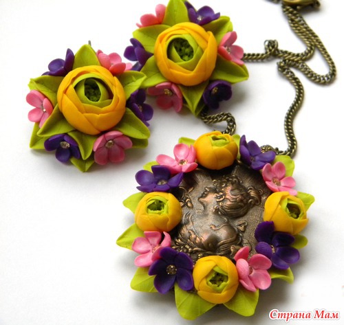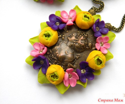 Под медальоном - пластика. На основу я прикрепила листья, потому цвета, сверху - медальон. и лютики приклеила жидкой пластикой.