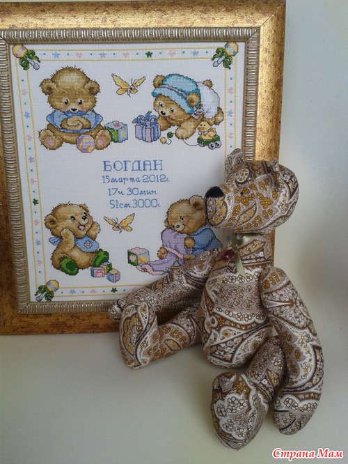 А возле кроватки наша любимая вышитая картинка с мишками - спасибо Юлечке (http://julialobanova.stranamam.ru/#tab6).
