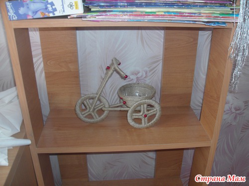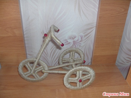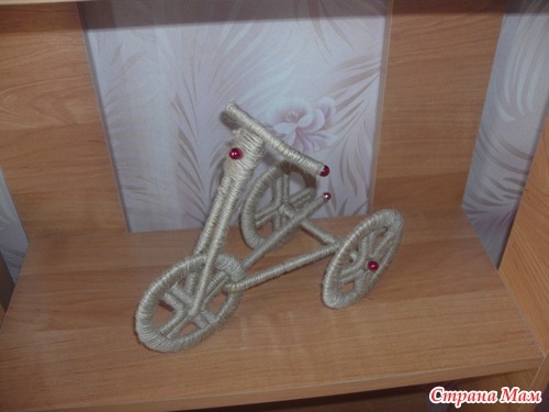 колёса из плотного картона-по два "бублика "склеены вместе и оплетены шпагатом, остальные детали-спицы в колёсах, рама, руль-из коктельных трубочек оплетённых шпагатом и горшочек-там подбирать нужно какой подойдёт у меня это крышка от большого стакана йогура