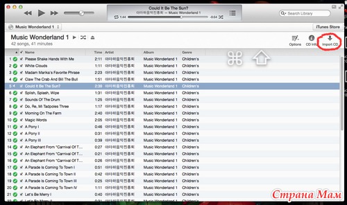 Я это делаю с помощью iTunes. Сегодня мне понадобилось загрузить в телефон музыку с дочкиного музыкального занятия, чтобы можно было слушать в дороге, да и дома. Музыка идет на диске. Поэтому я запускаю диск и импортирую его содержимое в библиотеку iTunes.