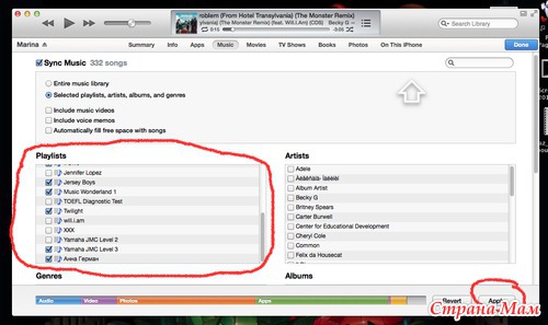 Для этого выбираем вкладку iPhone. Затем находим вкладку Музыка. И синхронизируем по удобному вам принципу. Можно выбрать плейлисты, исполнителей, жанры, отдельные песни. Мне удобнее плейлистами синхронизировать, поэтому делаю так.