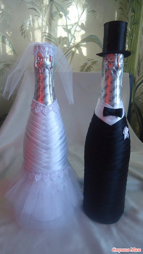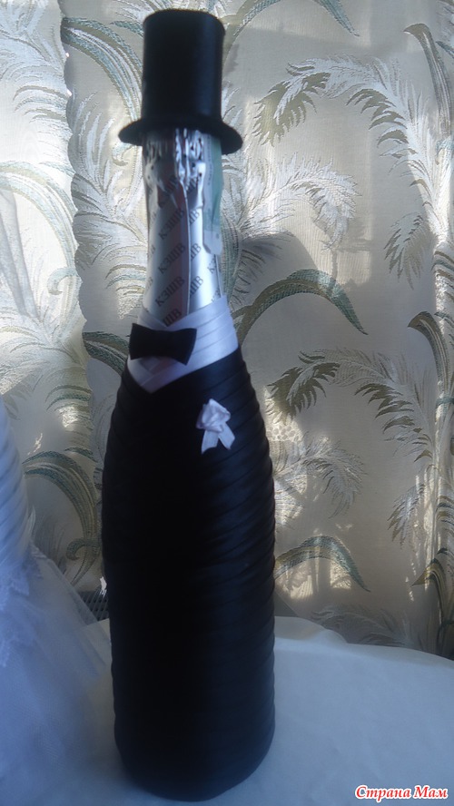 Спасибо!Жениху сначала сделала с картона,а потом обклеела лентой тонкой,а невесте так на бутылку и приклеела ,а другой раз делала маленькую картонную шляпку сёмную так удобней