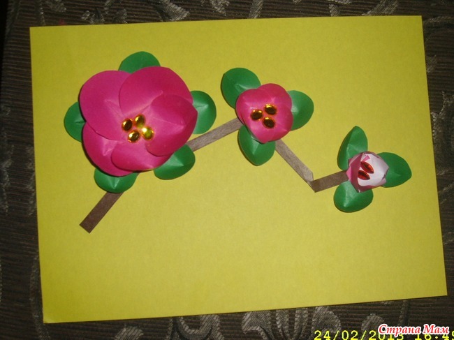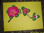. Вообщем натворили на первый раз неплохо. Типа цветущая ветка сакуры. Ребенок все старательно промазывал клеем и стразы, типа тычинки, тоже сам приклеивал. Теперь еще раздумываю насчет рамки какой-нибудь. Сделаем рамку и отнесем в садик.