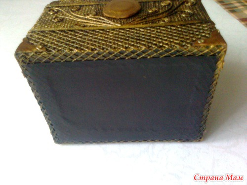 Всё! Клей DRAGON сделал своё дело, коробочка (теперь уже шкатулка) стала прочной, как из фанеры. Приступаем к украшению шкатулки. В качестве украшений у нас будут жгутики, скатанные из салфеток. Приклеивать их будем на клей ПВА. Хорошо промазываю клеем стык, который мне надо спрятать.