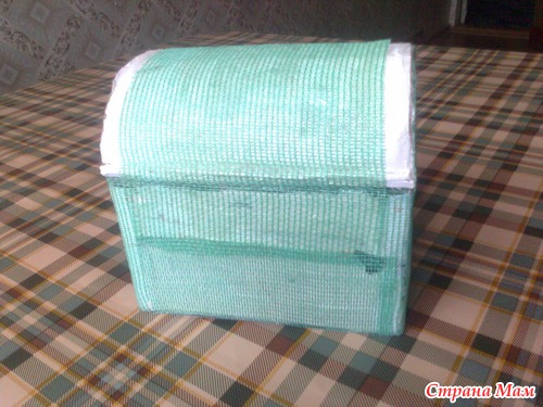 Для прочности коробки, всё обклеиваю москитной сеткой. Она придаст и прочность и красивую фактуру. Всё клею на DRAGON. Так как у меня сетки не хватает, остаются непроклеенные участки. Я их потом замаскирую под узоры. Вид спереди.