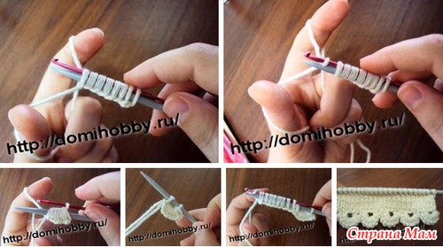 Этот декоративный набор петель может служить украшением края вязаного изделия. Для его выполнения понадобится спица и крючок, чем меньшего диаметра вы выберете спицу, тем мельче будут получаться фестоны.
