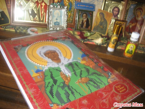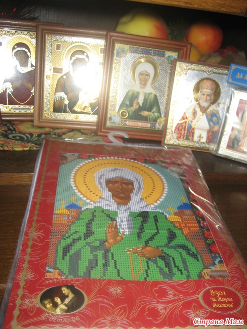 Потом зашла в церковную лавку и не удержалась купила себе вот такую красоту: Набор для вышивания бисером (пост начнется буду вышивать, чтобы это была не просто картинка, а икона) на заднем плане икона Матронушки с частичкой древа, освященного на мощах Матронушке, как мне объяснили, что к ней тоже можно прикладываться, если нет возможности прийти к самой Матроне.