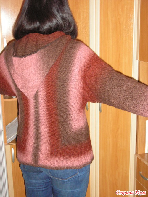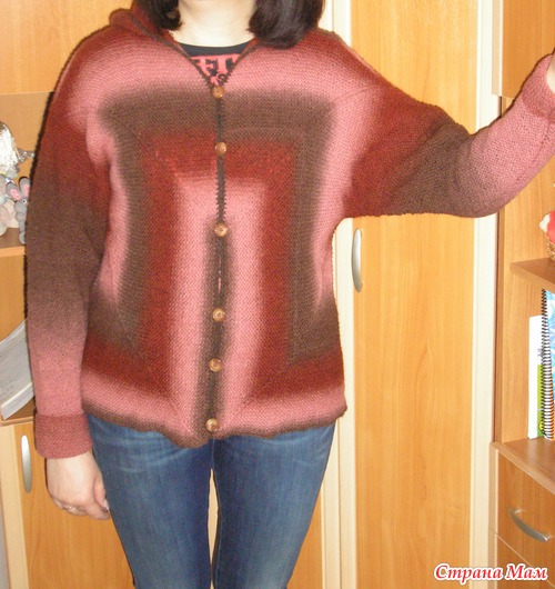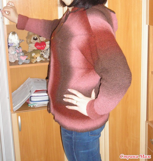 Подруга по форуму связала "Лисью кофту", тогда я увидела ее впервые, ну кофту, и мне так захотелось такую же... Бросила все и села вязать, связала половинку, смотрю, а ширина... ну можно заматываться. Сменила спицы, пересчитала и начала заново... Довязала до рукавов и оказалось, что ниток не хватает. Отложила заказала еще пасму. Пока ждала пряжу, сделала перерасчет и опять перевязала. На этот раз хватило и заказанная оказалась лишней, но Кауни лишней не бывает и ей найду применение. Вот что у меня получилось