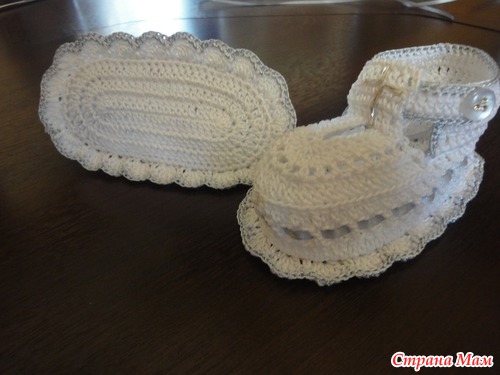 Пинеточки-сандалики с атласной каймой, крестиками из стекляруса и пуговичками с камушками, по стопе на 11,5 см.