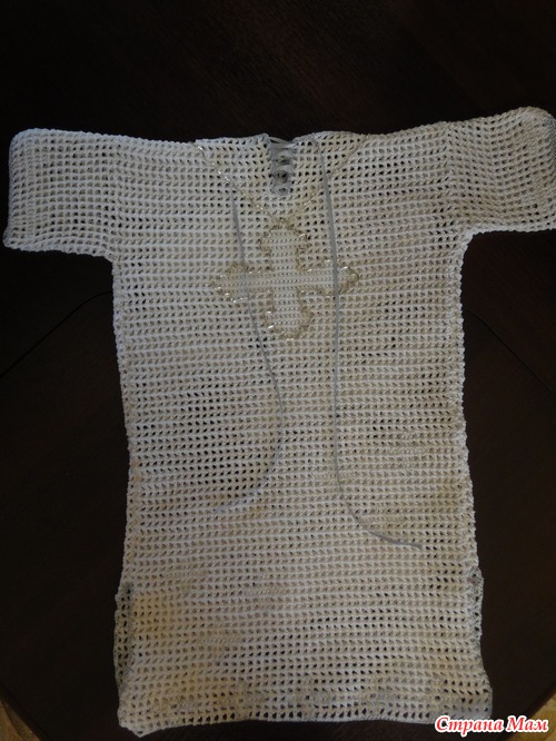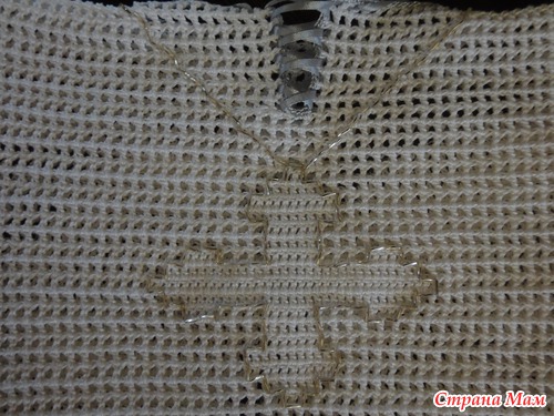 Перед-крест и цепочка из стекляруса, внизу и по краям рукава маленькие крестики, с вышитым контуром.