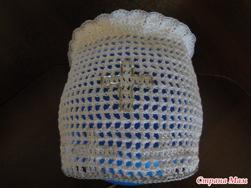 Чепчик так же с атласной каймой и крестиком из стекляруса, примерно на О. Г. 44 см