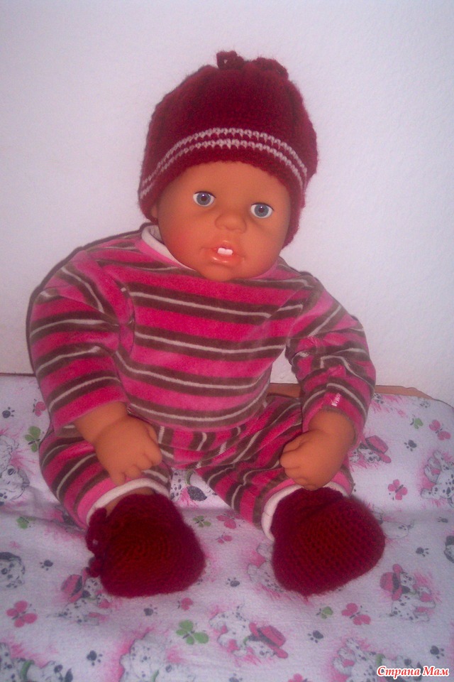 Вот была кофточка и дочке стала мала, получились штанишки и кофточка для нашей куклы. Ну и шапочка с носочками крючком связались.