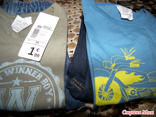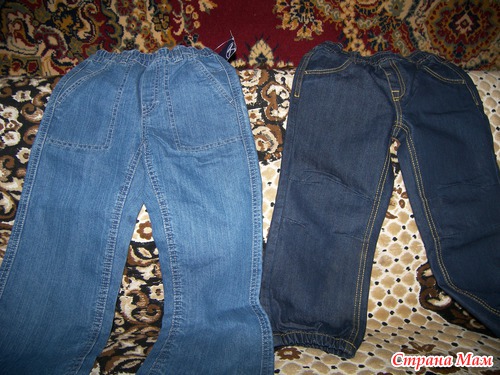 Цены не всегда были дешевле наших местных, но если тщательно покопаться на сайте, то можно было найти довольно интересные вещи по интересным ценам. Джинсы детские у нас обычно дорогие, а если и есть дешевые, то очень тонкие и быстро рвутся и снашиваются. Поэтому первое, что я рискнула прикупить, были штаны ребенку на вырост. Хочу сказать, что соотношение цена-качество здесь пропорциональное. Джинсы довольно плотные, так что штанами я осталась довольна. Вещи все на вырост, потому фотографирую так, модели все слишком большое пока ))
