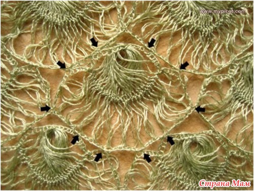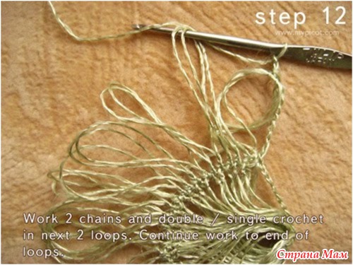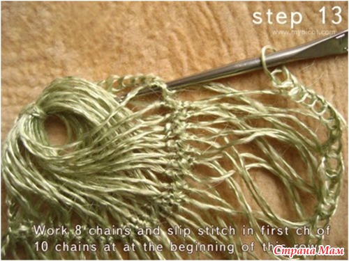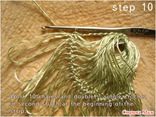 Далее опять цепочка из 10 петель и полустолбик у основания длинной петли
