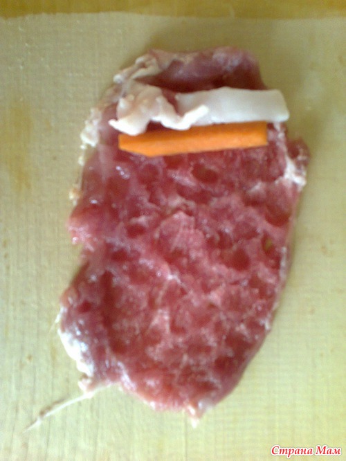Мясо отбиваем, морковь и сальце нарезаем полосками.